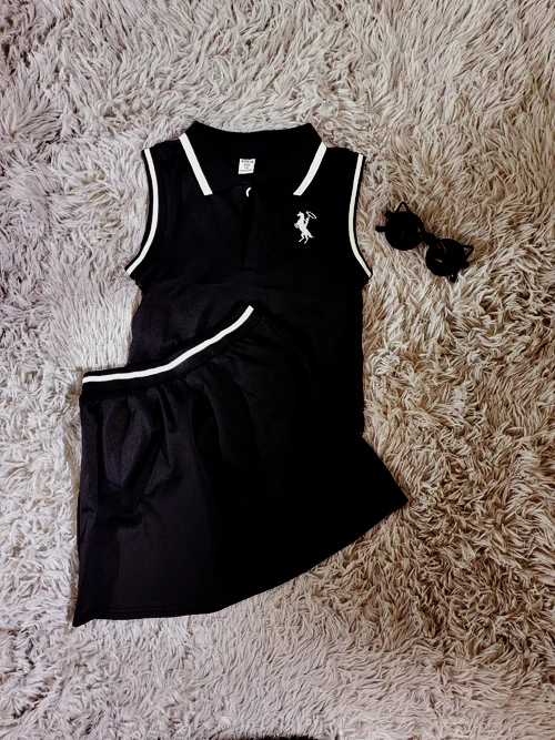 Conjunto falda y blusa negra, la falda ofrece un ajuste favorecedor con excelente caída, mientras que la blusa complementa el look con un diseño sofisticado y versátil.