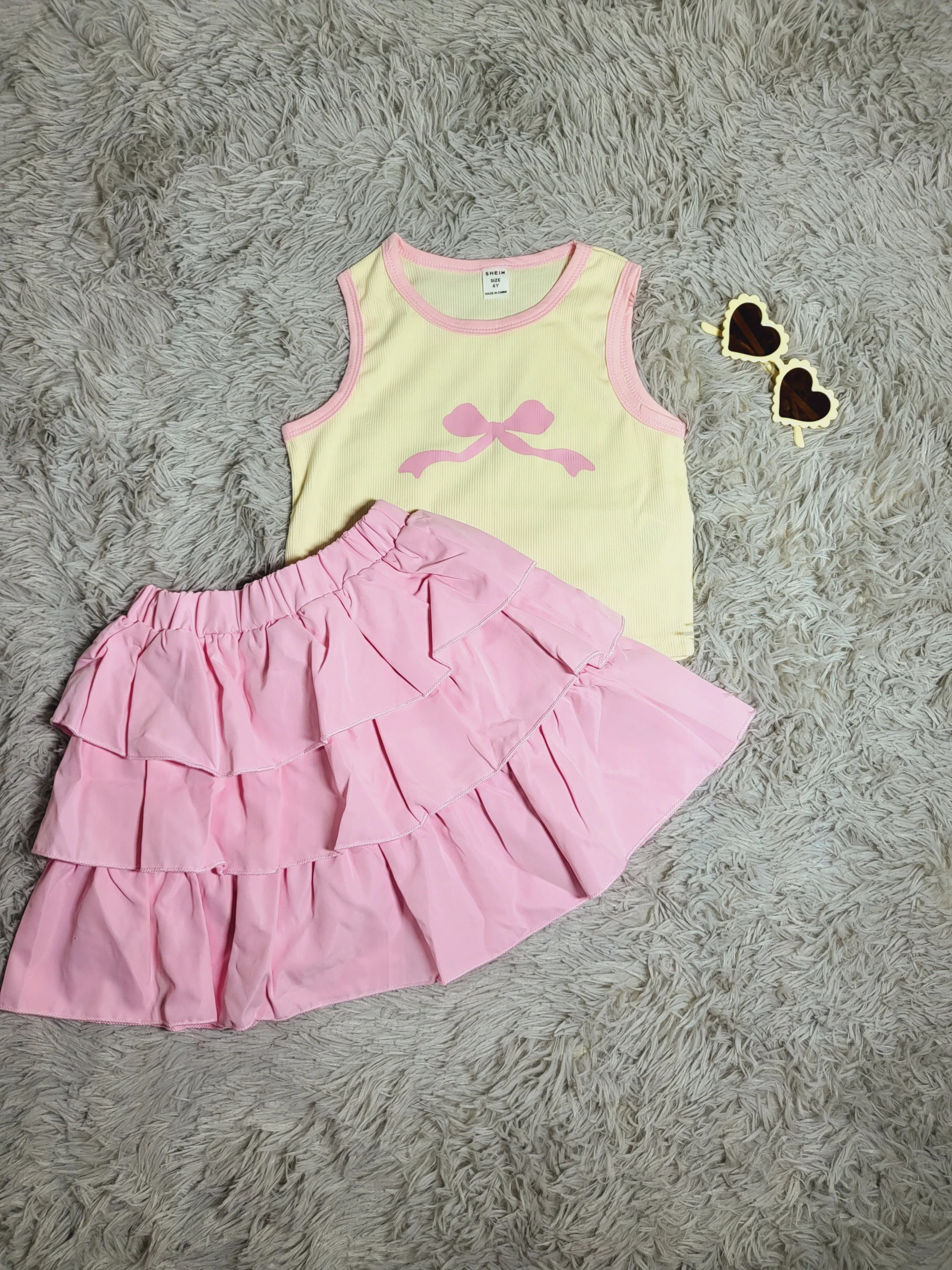 Este hermoso conjunto para niña está pensado para resaltar la dulzura natural de las más pequeñas. La blusa en tono claro con un delicado lazo rosado aporta un toque elegante y sutil, mientras que la falda rosada con volantes añade movimiento, frescura y un estilo irresistible.