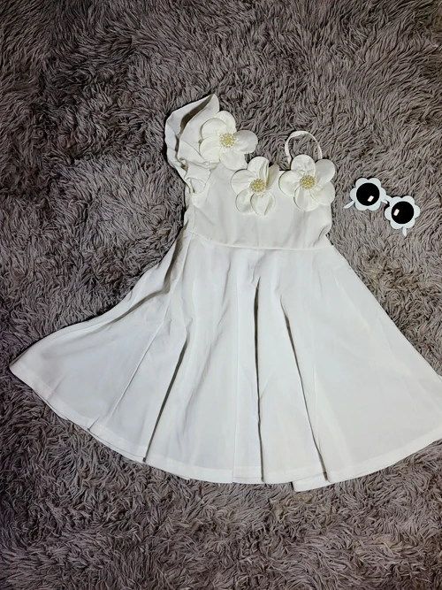 Vestido elegante en color blanco, con diseño liso y detalle de flor decorativa en el hombro, que aporta un toque romántico y femenino. Tela suave y cómoda, ideal para ocasiones especiales.